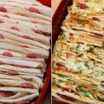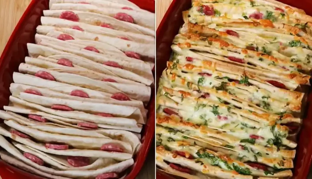 Sastojci:tortilje (koliko je potrebno da se ispuni pleh)3 jajeta120 ml mlijekaso, po ukusu150 g rendanog kačkavaljasvjež peršun, sitno sjeckan150 g čajne kobasice, isječene na kolutove100 ml ulja (za prelivanje)