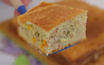 Manji pleh ili kalup nakvasite vodom sa unutrašnje strane, a zatim ga obložite papirom za pečenje. Sipajte smjesu u pleh i pecite oko 35–45 minuta na 170 stepeni.